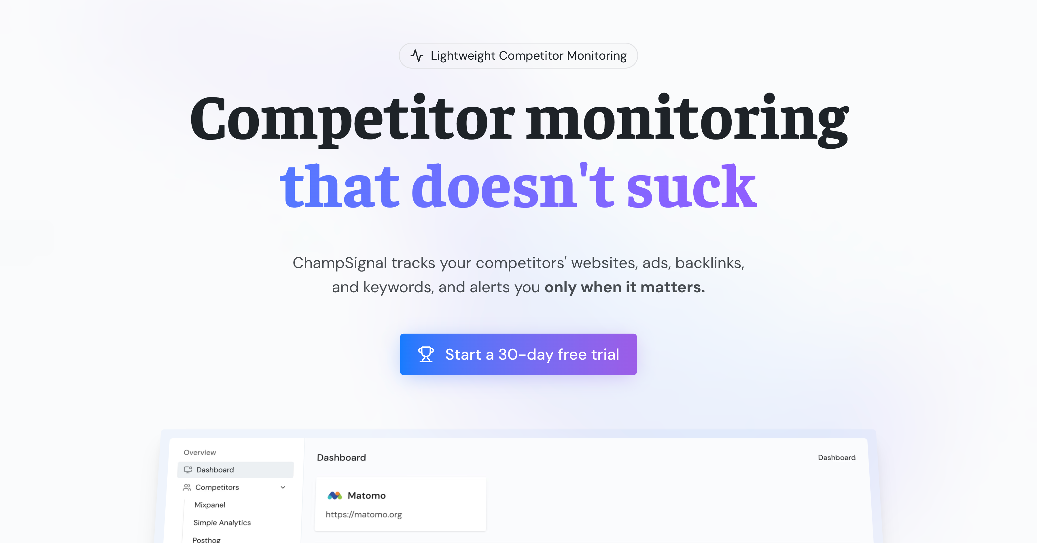 ChampSignal is a competitive intelligence tool that monitors competitors' online presence, tracking their website activity, social media mentions, advertisements, backlinks, and keyword usage. It provides timely email alerts to notify users of significant changes, enabling them to stay informed and make data-driven decisions.