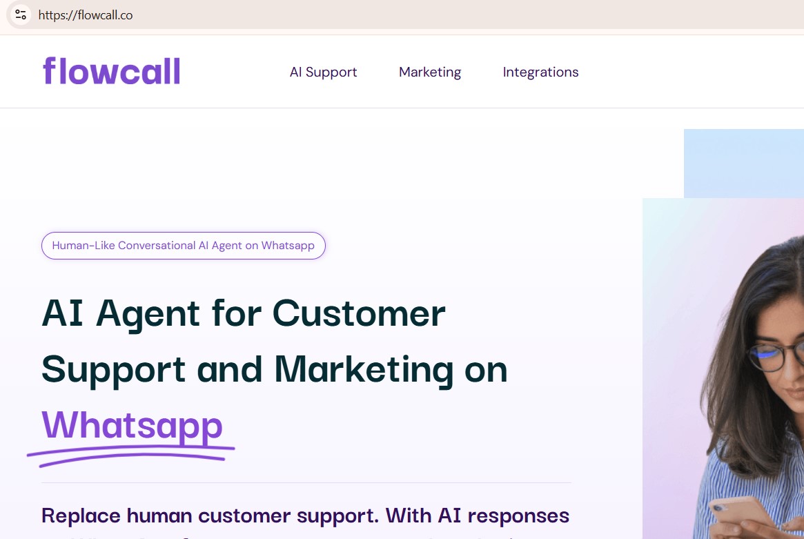 Flowcall builds customized AI calling agents for businesses that sound like humans, handling complex tasks like selling and upselling. They offer AI-powered solutions to enhance sales and customer support efficiency, providing an omnichannel inbox to automate tasks and streamline operations. Flowcall also offers WhatsApp automation for businesses to boost engagement and drive conversions, delivering human-like AI customer support and ecommerce automation.