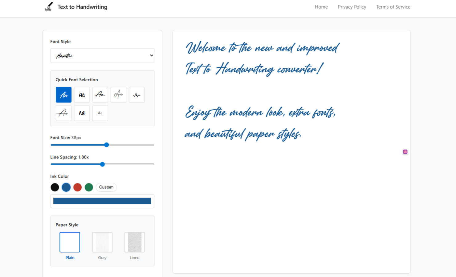 Free Text to Handwriting is an online tool that converts typed text into realistic handwritten notes. The service allows users to customize fonts, paper, and ink to create personalized handwritten content. It is particularly useful for students and teachers looking to create authentic-looking notes. The tool is available for free and can be used instantly online.